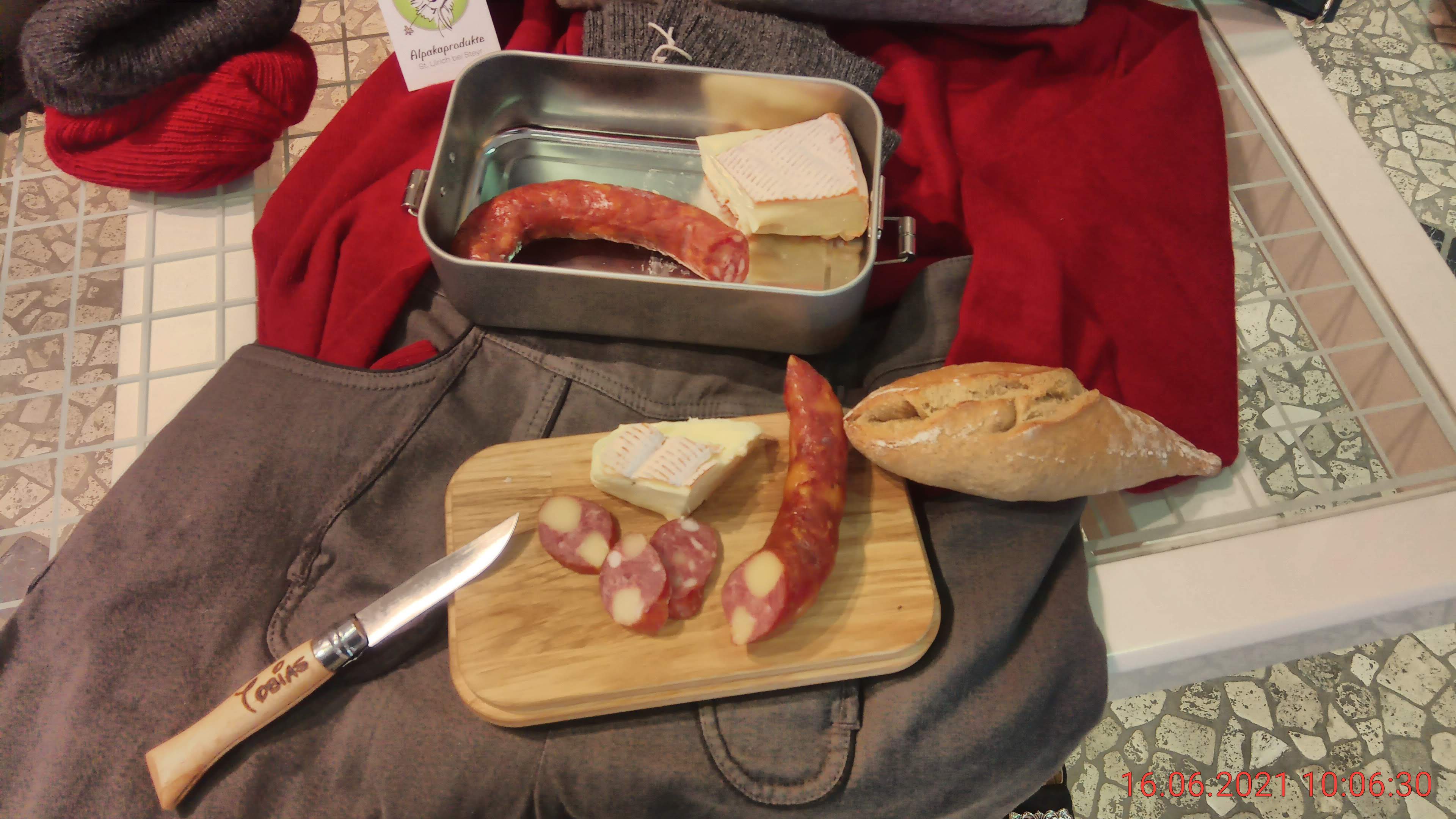 Diese nachhaltige Jausenbox aus Weißblech ist mit einem Eichenbrett bestückt in das ein hochwertiges Klappmesser integriert ist.